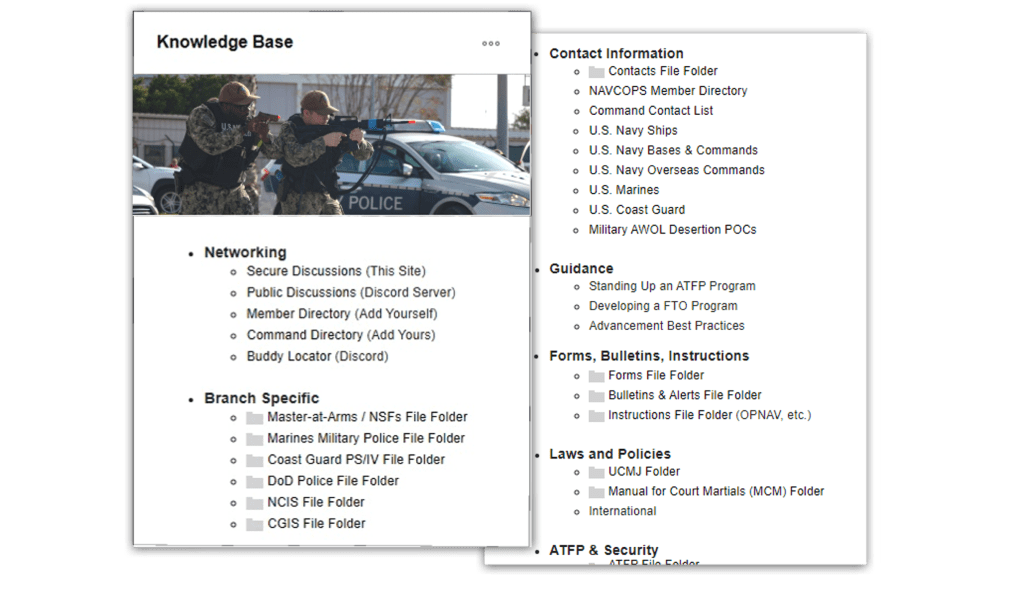 We provide two community experiences. Our secure site is available for active/reserve military in law enforcement and ATFP roles. We also have public discussion boards where you can talk and have fun with others in the community. Both are free to join/use separately or together.
